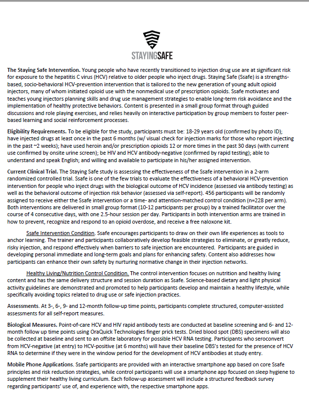 If you answered YES to the questions above, you may be eligible to participate in the Staying Safe Intervention, a local research study. Participation includes FREE Hep C and HIV testing, and compensation for your time!