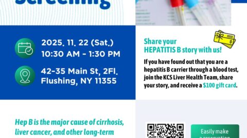 Korean Community Services (KCS) is providing free Hep B screenings at 42-35 Main St, 2 Fl, Flushing, NY 11355.